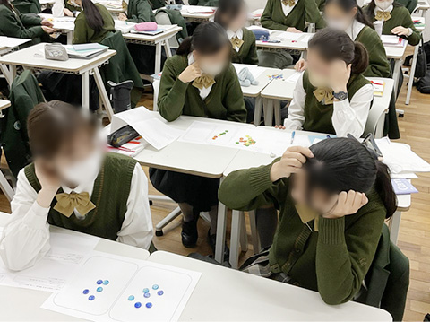 平井 たとえば、「ミネルヴァ像(校内のアトリウムにある彫刻作品)の高さを測ろう」「おはじきゲームの必勝法を編み出そう」などのミッションを課すことによって、生徒に「どうすればうまくいくのか」を主体的に考えてもらう機会を大切にしています。これらの課題の行きつく先は「比」や「整数論」ですが、試行錯誤のプロセスを通じて生徒自身がその本質に気づくことが重要だと考えています。また、教科横断型の授業にも力を入れており、中2では国語の小説に出てくる現象が実現可能かどうか数式を立てて確かめたり、中3では理科のpHを対数の概念と一緒に学んだりと、生徒の好奇心をかき立てるようなテーマを入り口に、教科の垣根を超えた学習を展開しています。