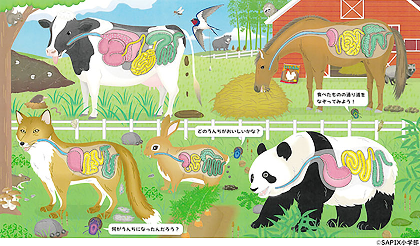 前回に続き、3年生のテキストのイラストを見てみましょう。動物園などで観察をすると、みなさんは動物のどんなところに注目をしますか?顔やからだの色や模様、大きさ、鳴き方、歩き方など、さまざまな視点で動物を見て「そうなっている理由」を考えてみましょう。上のイラストに注目すると、実際に動物園に行ったときにも、どうしても気になってしまうものがたくさん描かれていますね。そう!うんちです!動物園で、特に哺乳類や鳥類の飼育スペースには、よくあるのです、うんち。多くの動物たちは、自分たちのうんちを意にも介さず踏んで歩いたり、カバやカピバラなどは自分のうんちで濁った水の中に潜ったりしますから、どうしても気になってしまいます。動物ごとに異なっているうんちに注目すると、その動物の食べるもの、さらに動物の口のつくりについても、そうなっている理由を考えることができます。食べるという行動は、動物にとってとても重要な行動なので、そこをくわしく見ていくと、動物のいろいろなことが分かってくるのですね!